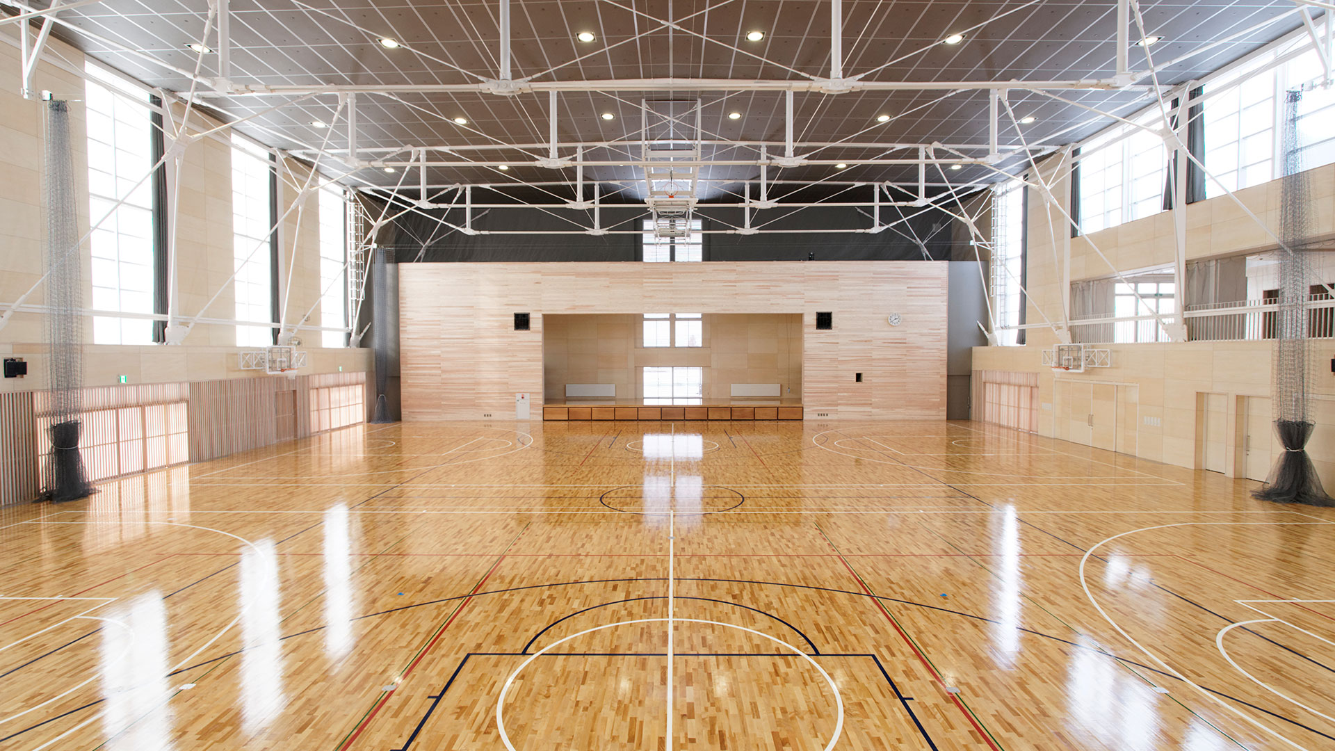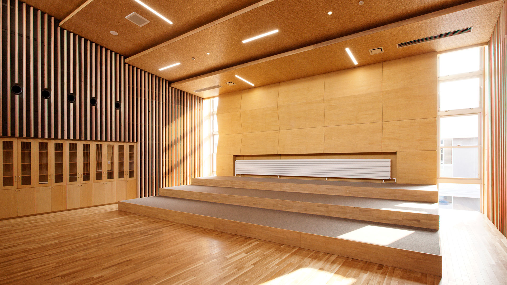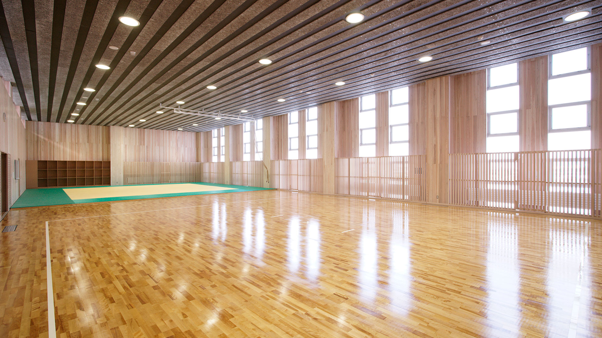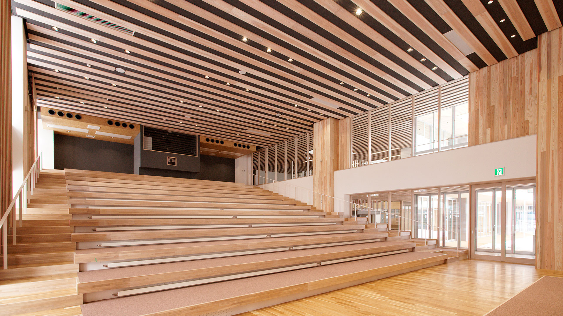 山辺町役場、中央講演に隣接し、美しい田園風景の中に建つスタイリッシュな中学校。低層2階建のコンパクトにまとめられたプランとなっており、周りの風景にうまく溶け込んでいます。内部は、床と天井に木質材料を用い、温かみのある内装に。冬は全館パネルヒーターを採用し、冬の厳しい寒さにも負けることなく、生徒みんなが快適な学校生活を送っています。