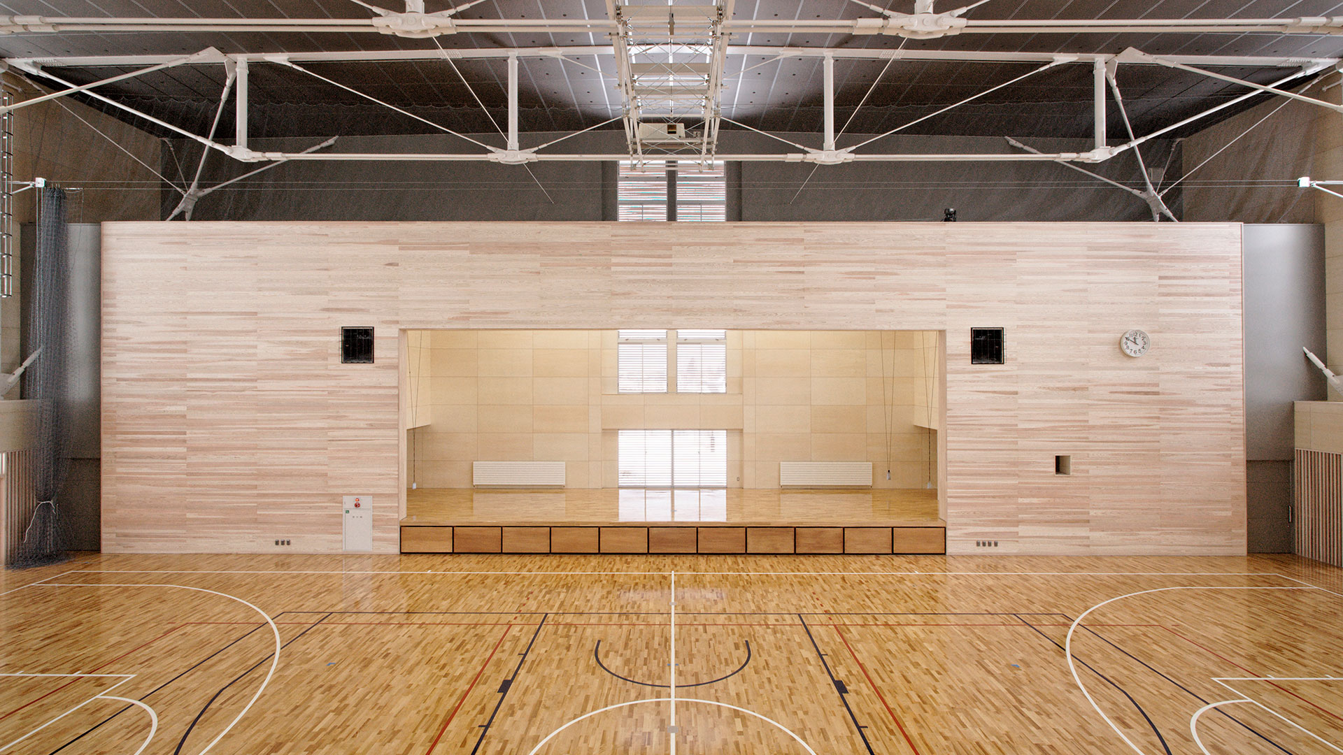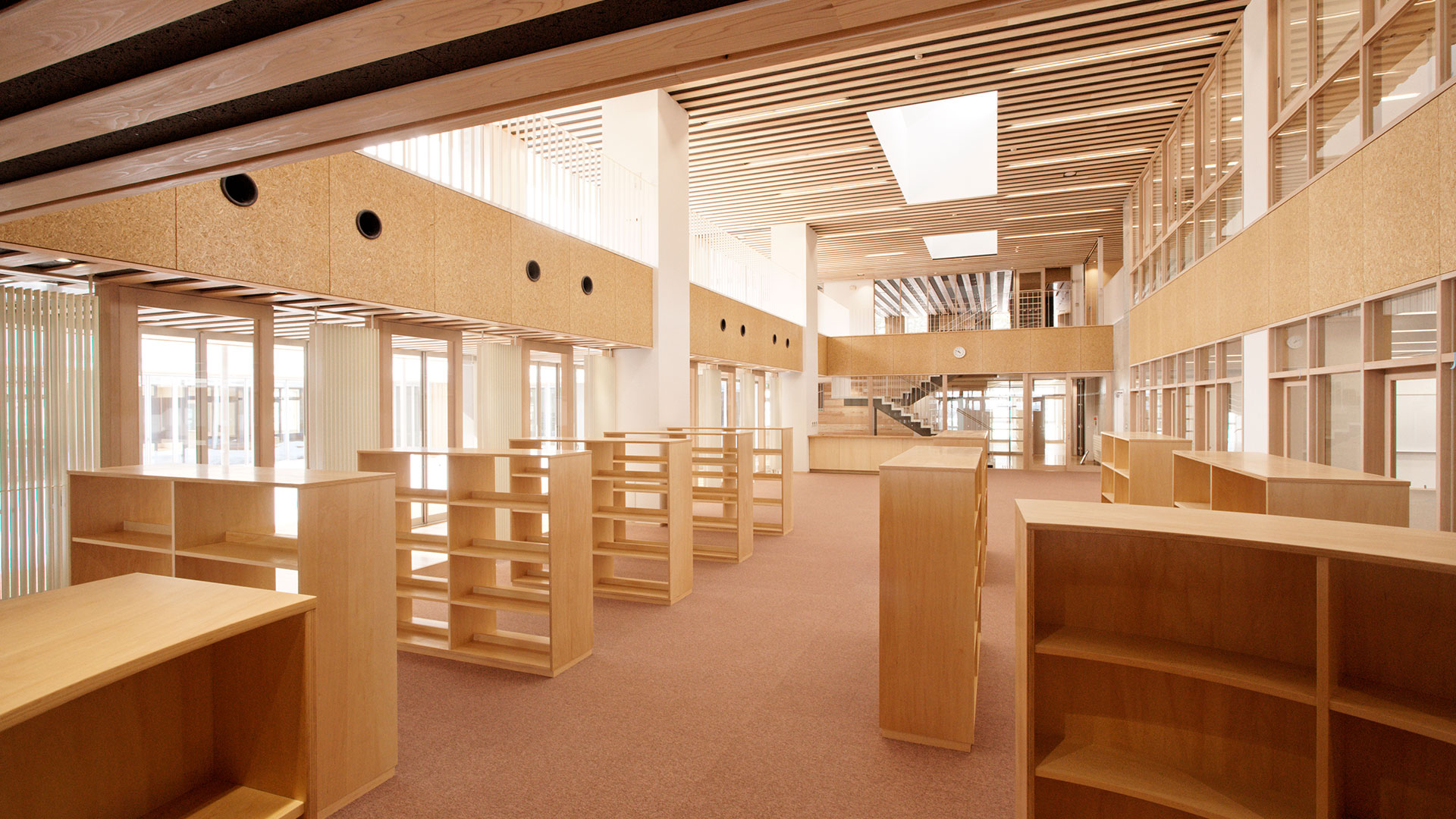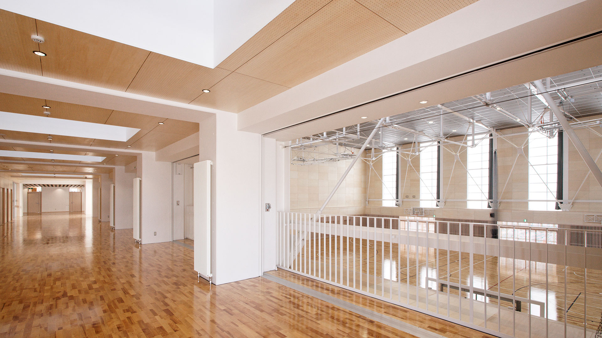 山辺町役場、中央講演に隣接し、美しい田園風景の中に建つスタイリッシュな中学校。低層2階建のコンパクトにまとめられたプランとなっており、周りの風景にうまく溶け込んでいます。内部は、床と天井に木質材料を用い、温かみのある内装に。冬は全館パネルヒーターを採用し、冬の厳しい寒さにも負けることなく、生徒みんなが快適な学校生活を送っています。