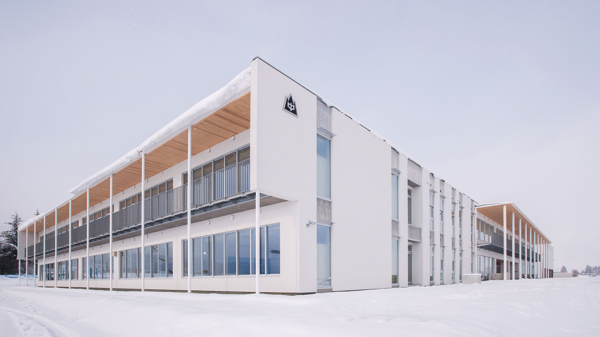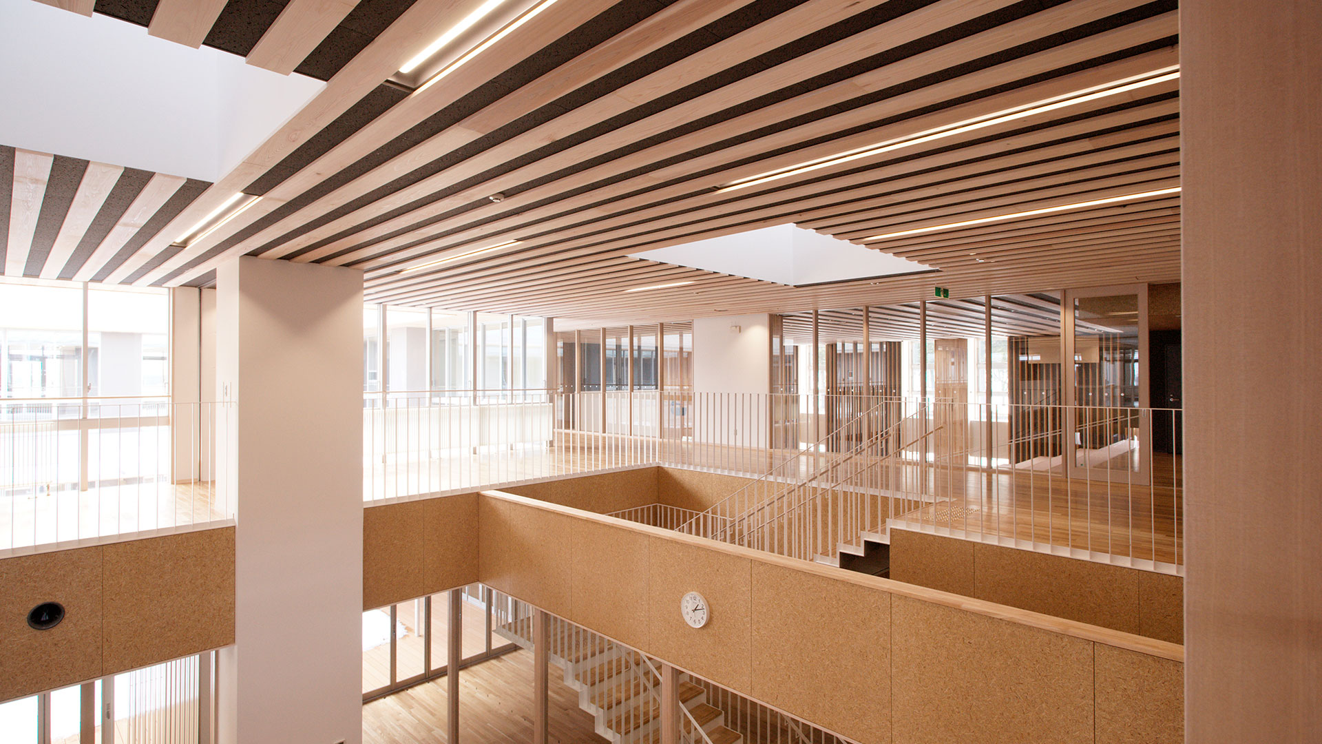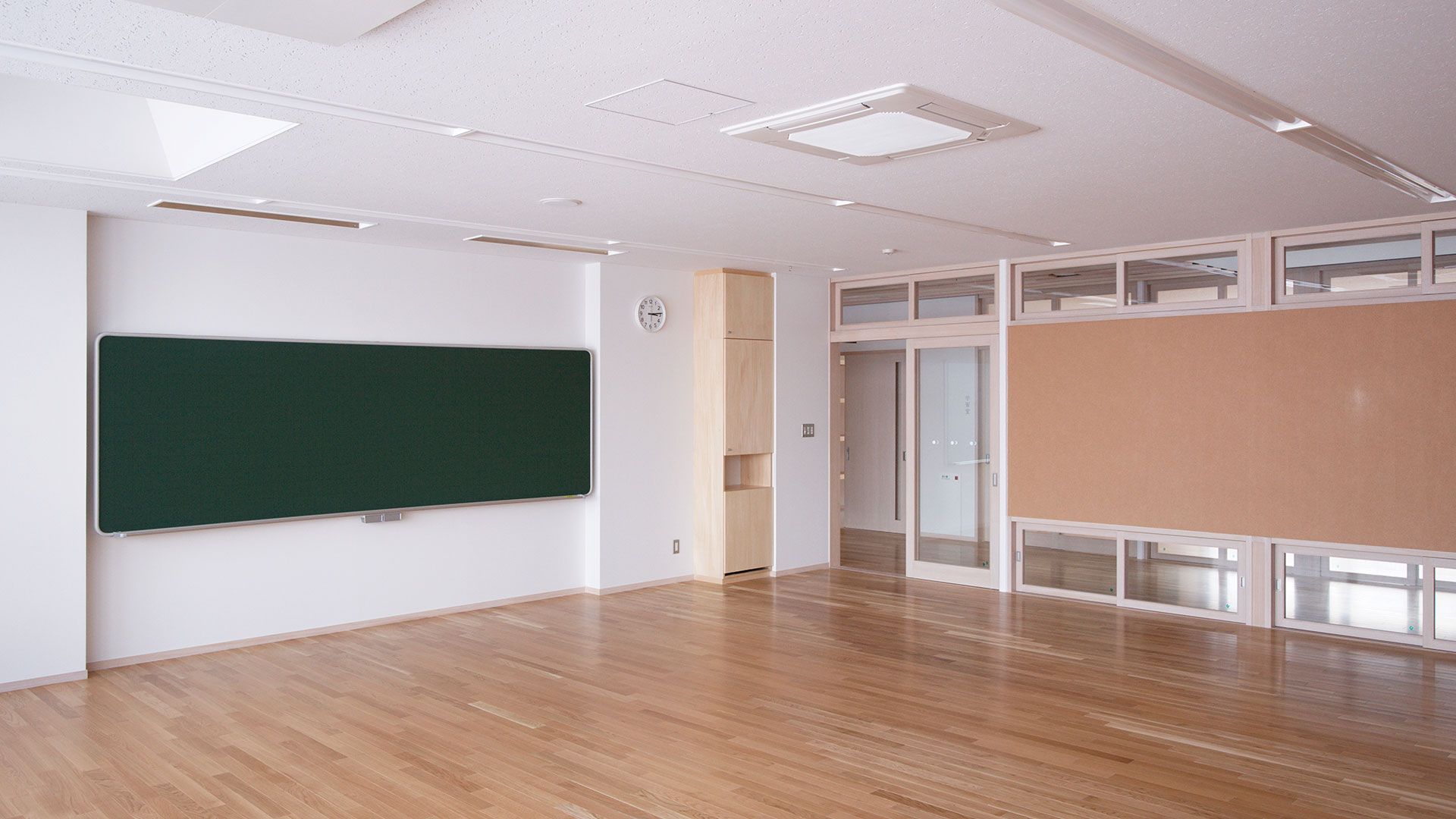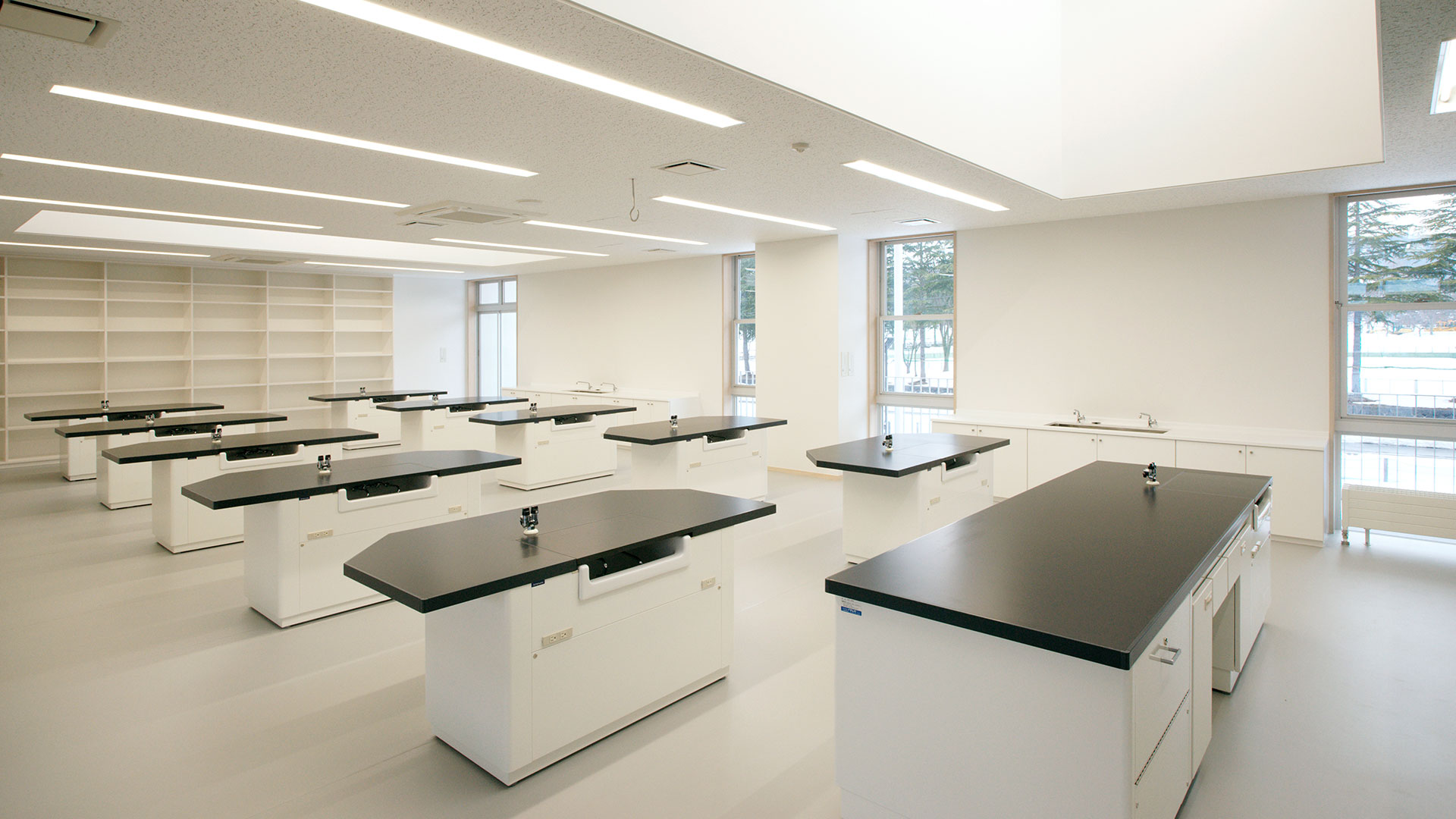 山辺町役場、中央講演に隣接し、美しい田園風景の中に建つスタイリッシュな中学校。低層2階建のコンパクトにまとめられたプランとなっており、周りの風景にうまく溶け込んでいます。内部は、床と天井に木質材料を用い、温かみのある内装に。冬は全館パネルヒーターを採用し、冬の厳しい寒さにも負けることなく、生徒みんなが快適な学校生活を送っています。