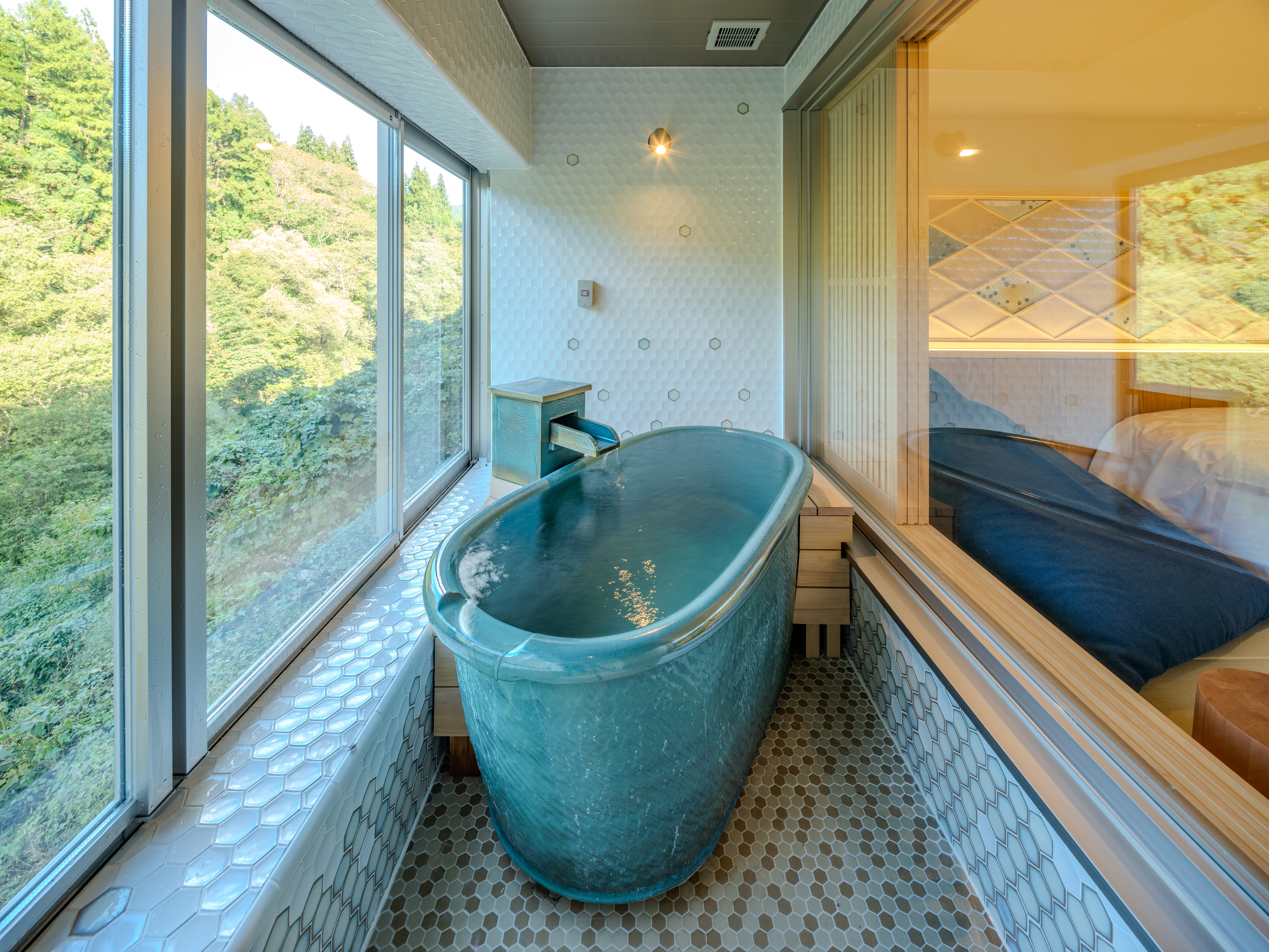 半露天寝湯は、総青森ヒバ造りのかけ流し浴槽で、雪のグラデーションをイメージしたタイルで装飾されています。